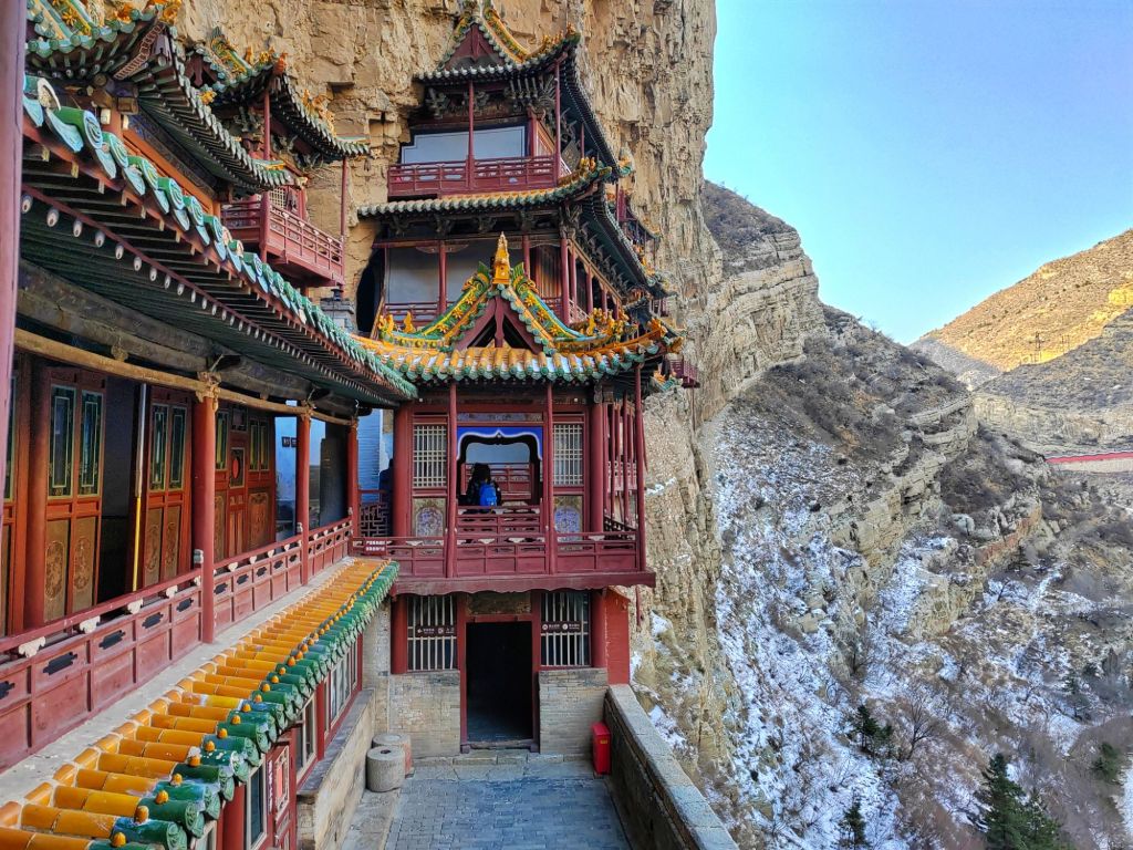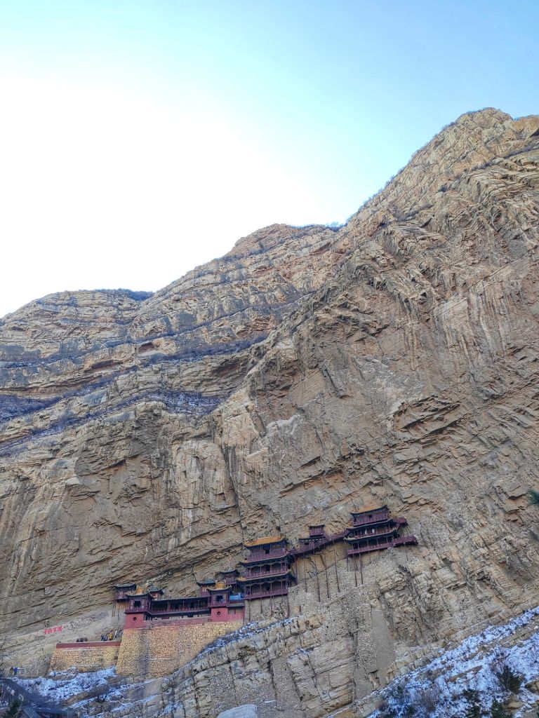 Yungang Grottoes from the exterior, their dimensions are massiveOne of the 252 caves of Yungang Grottoes, carved statues are as tall as 40 meters and neatly decorated.Hengshan Hanging Temple, glued to the mountain and unaware of time and gravity.A closer look of Hengshan Hanging TempleHappy but cold, in the Shanxi region in Winter temperatures are very low. In January during the night and in the ealy morning it was around -19°C